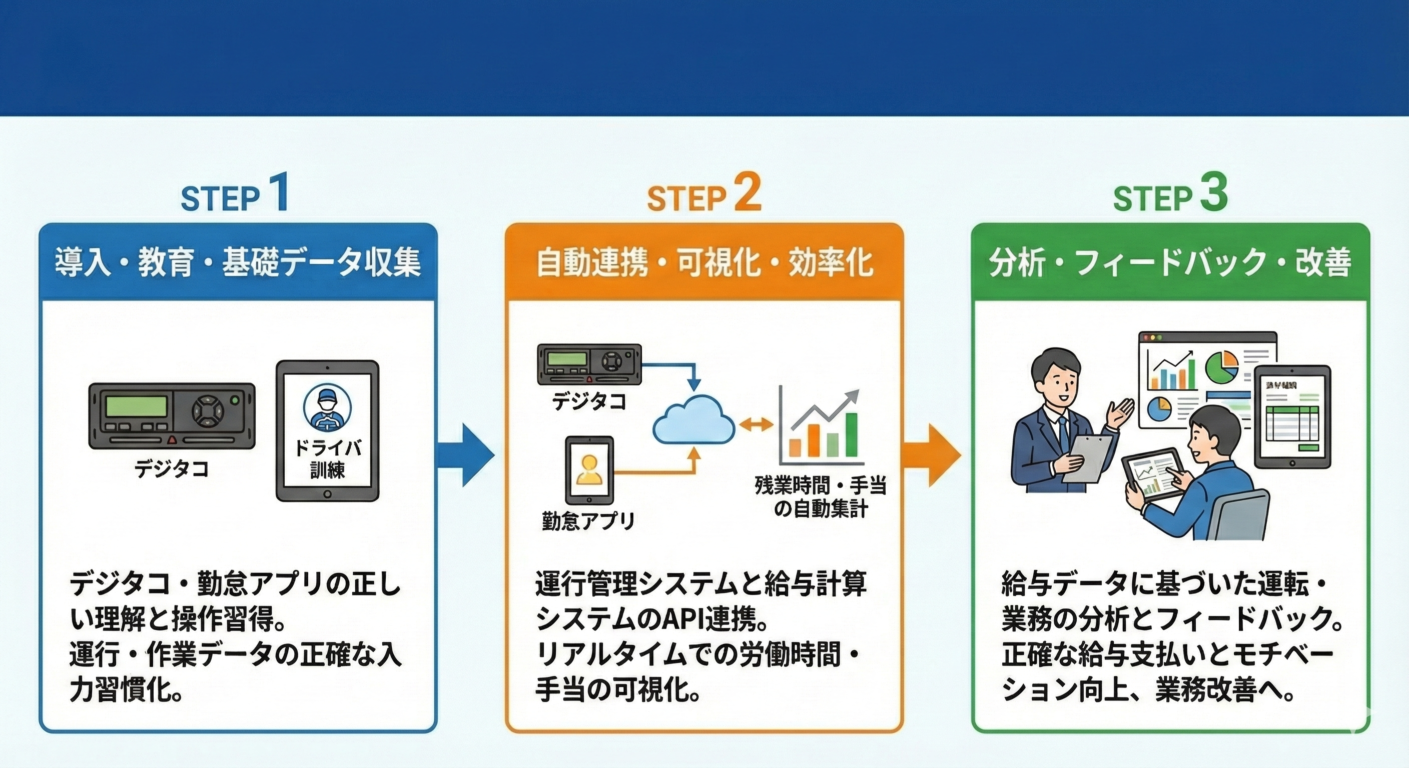 前回のコラムでは、「運送業の給与DX」を確実にすすめていくために、デジタコ等の記録機器を使っていこう、そのツールにドライバーがしっかりと入力できる体制をつくろうというお話をしました。