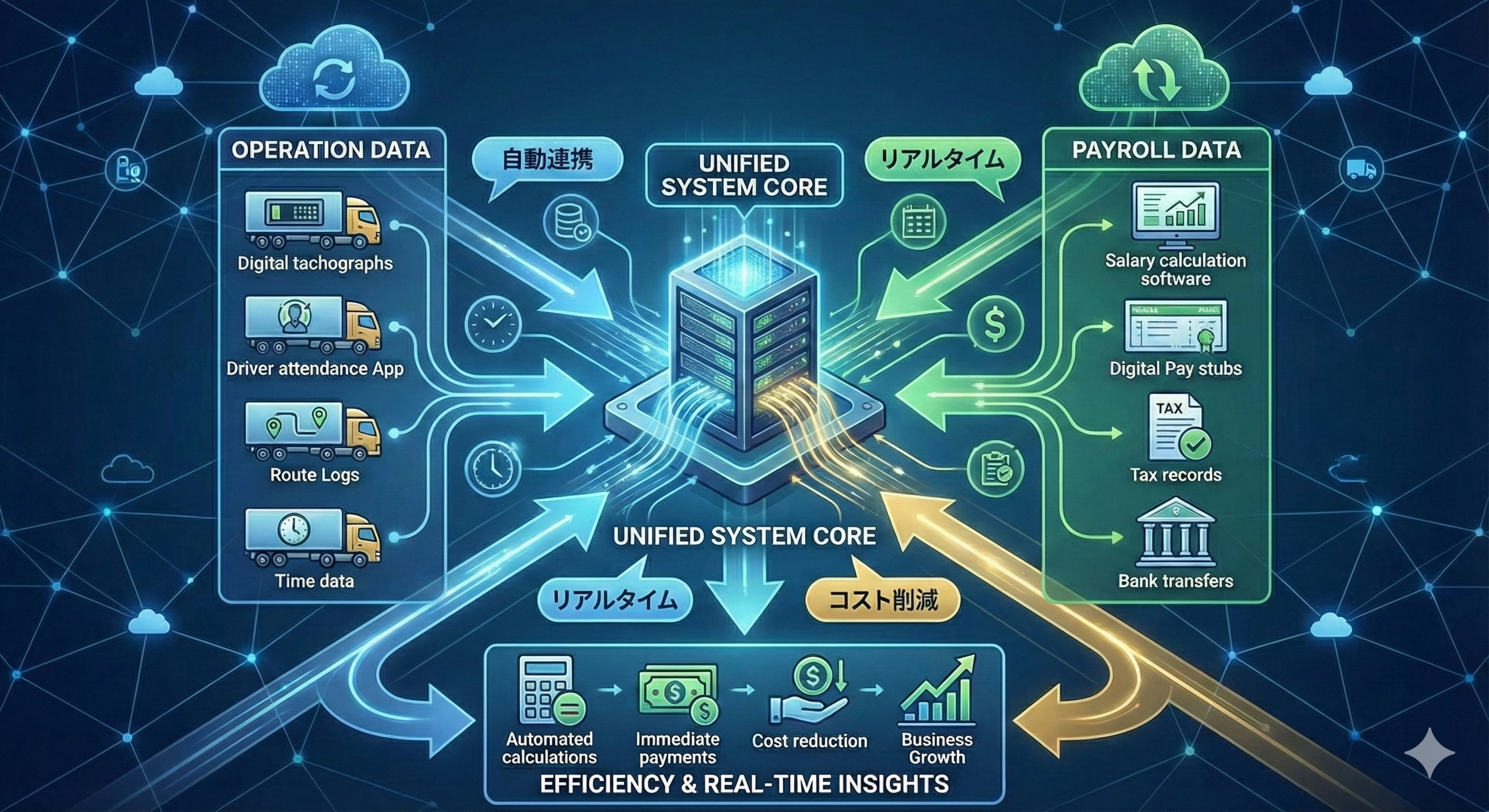 デジタコがうまく操作できている場合や、アプリなどで日報を作成している場合は、①〜③の作業はITの力で解消することができます。 しかし④の「合計を給与システムに入力」という手作業が残るのであれば効果半減という感想をもってしまいます。