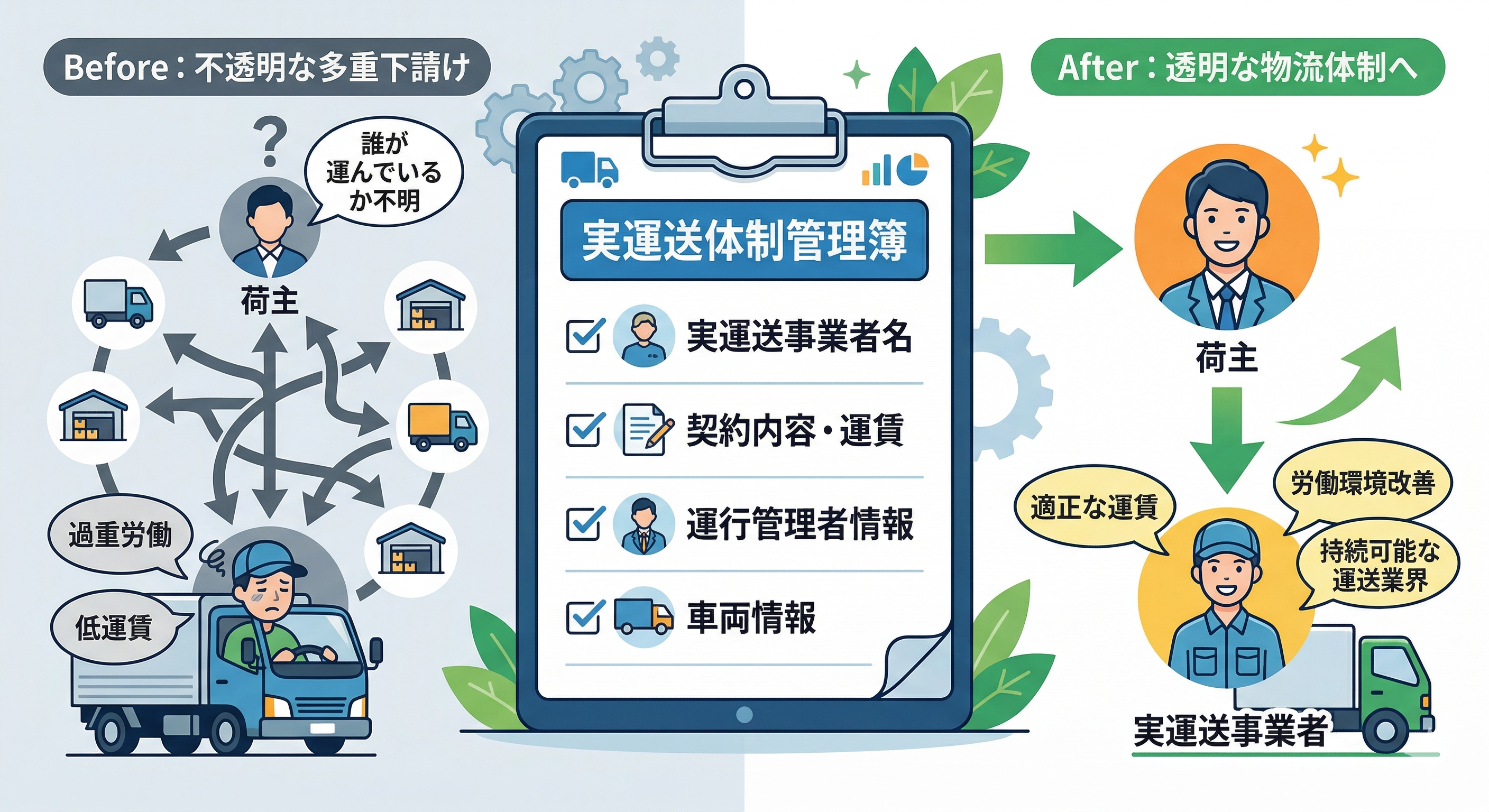 今回のコラムでは、2025年4月から導入が決定している「実運送体制管理簿」について、その概要と運送業界への影響を詳しく解説していきます。