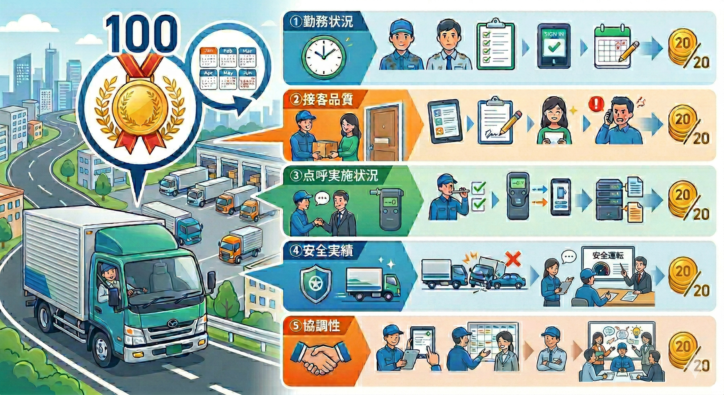 | ⑤協調性 | 指示遵守、配車調整協力、報連相 | 20点 | 管理者所見・定期評価面談記録 |