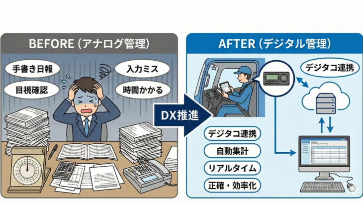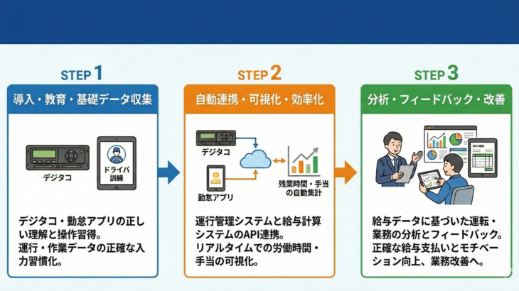 前回のコラムでは、「運送業の給与DX」を確実にすすめていくために、デジタコ等の記録機器を使っていこう、そのツールにドライバーがしっかりと入力できる体制をつくろうというお話をしました。 デジタコや運行管 […]