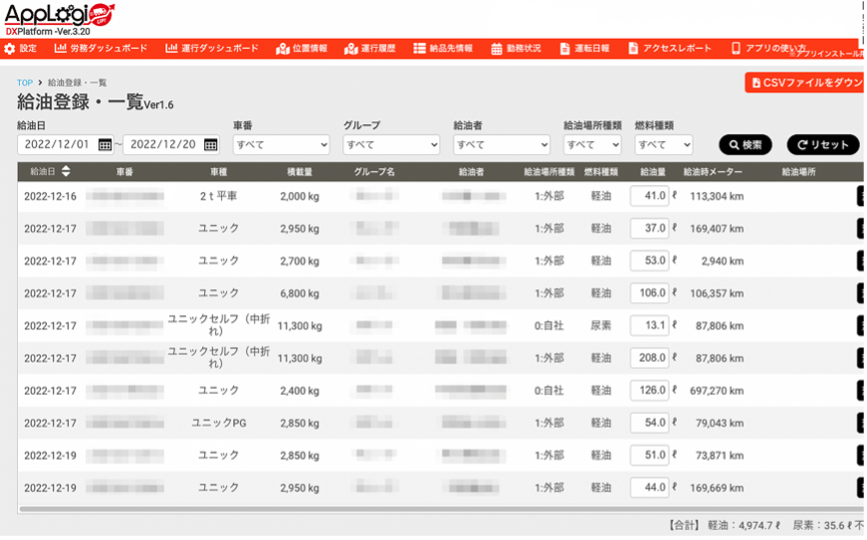 これによって給油のデータベースが事務所に自動で出来上がってくると、あとはこのデータから請求書に変換したり、車両別の給油量や使用量の合計を算出したり、燃費のランキング出したりなどなど様々なデータを作成することができます。